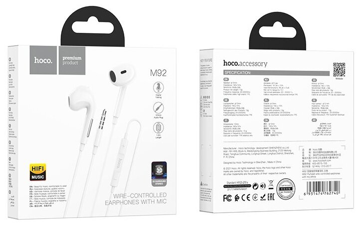 Наушники M92, Plumelet wire-controlled earphones with mic, HOCO, белые