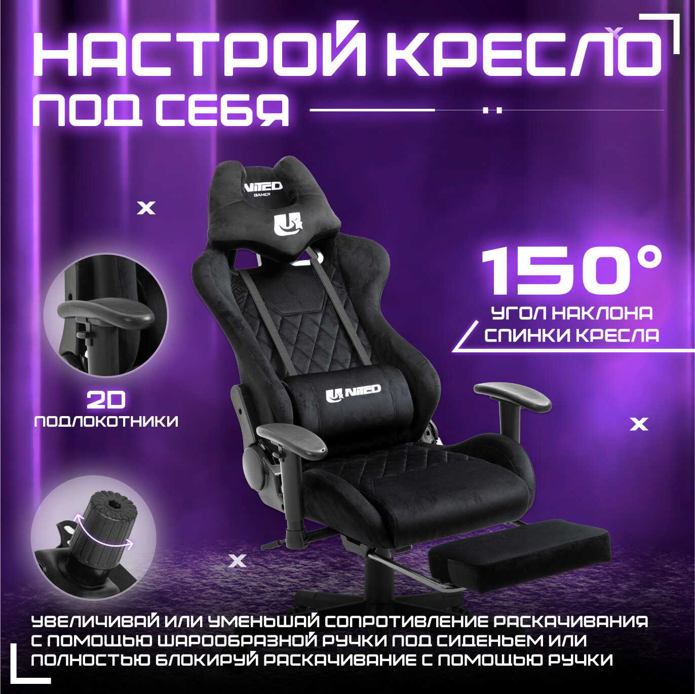 Кресло компьютерное UNITED GAMER WARRIOR, подставка для ног, черный велюр информация: