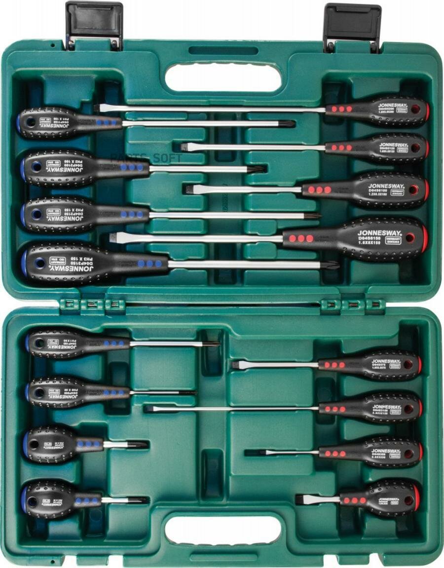 Набор отверток стержневых FULL STAR, 16 пр: SL3 х50/150мм, SL5,5 х75/125/200мм, SL6,5 х38/100мм, SL8 х150мм, PH0 х60/80мм, PH1 х38/80/150мм, PH2 х38/150мм, PH3х150мм JONNESWAY D04PP16S | цена за 1 шт