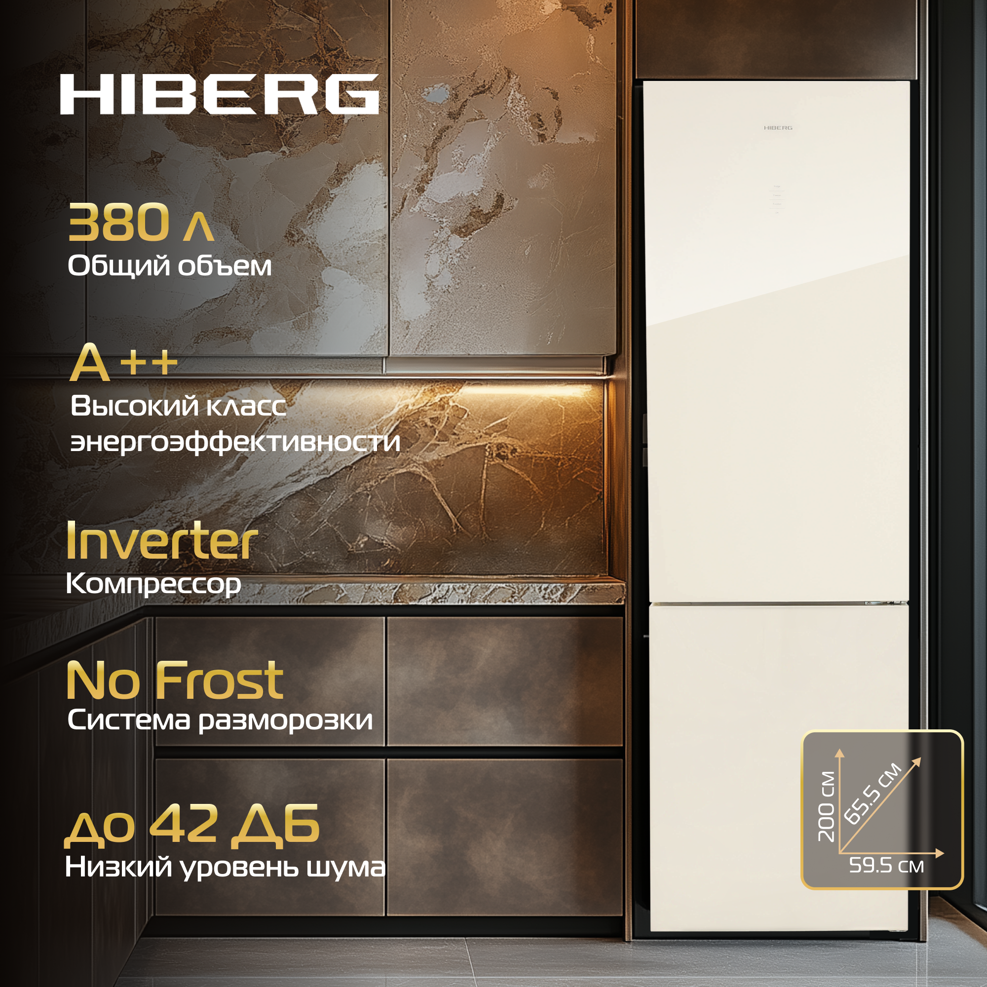 Холодильник HIBERG RFC-400DX NFGY inverter отдельностоящий, инвертер, высокий, комби, 2 метра, 380л объем, бежевое стекло