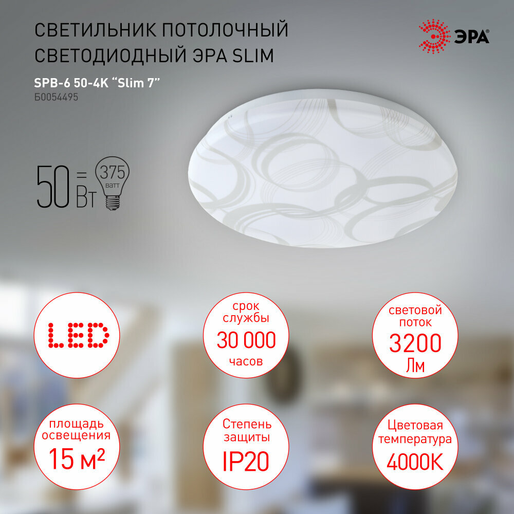 ЭРА Светильник потолочный светодиодный ЭРА SPB-6-Slim 7 50-4K без ДУ 50Вт 4000K информация: