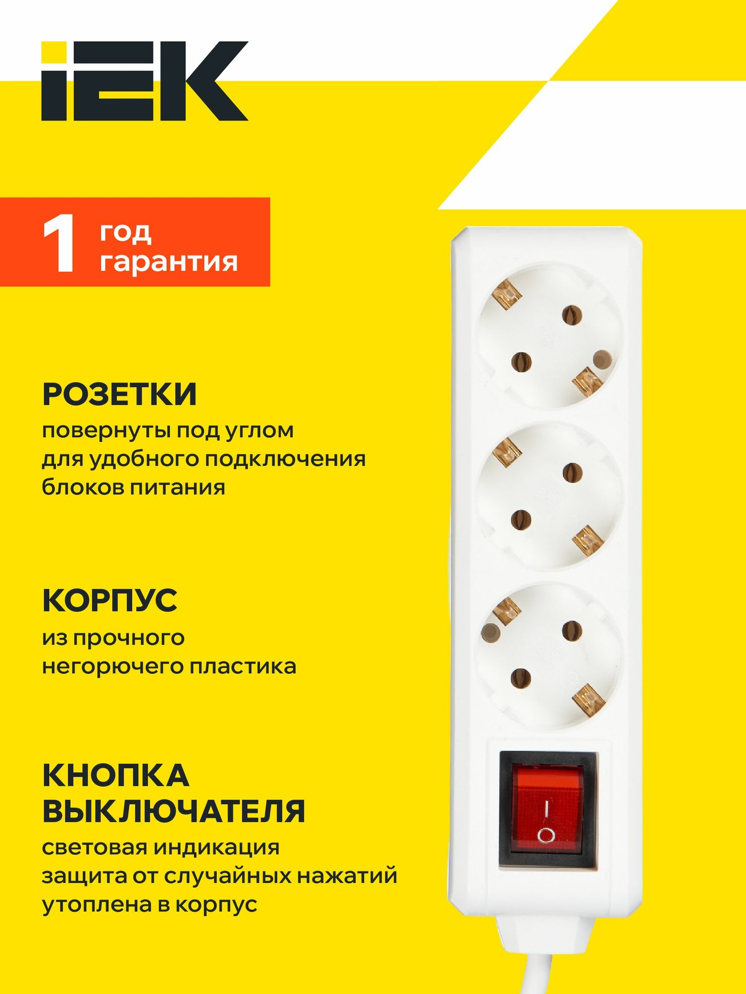Удлинитель с выключателем IEK У03К-выкл, ПВС 3 x 1 мм², с заземлением, 3 розетки, 1,5 м, белый