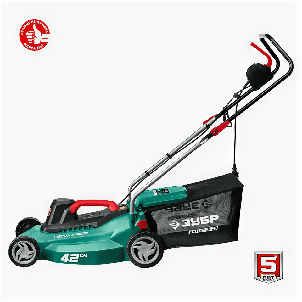 1 Газонокосилка сетевая ЗУБР ГСЦ-42-2000, 2000 Вт, 3200 об./мин, ширина скашивания 42 см, ГСЦ-42-2000