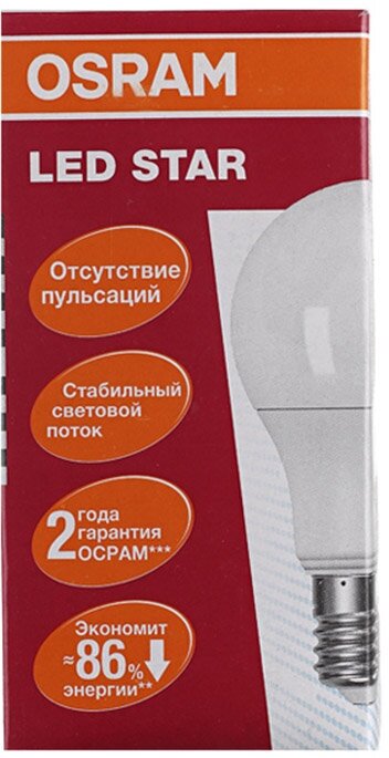 Лампа светодиодная OSRAM LED Star, 470лм, 5Вт замена 40Вт, 2700К теплый белый свет, Цоколь E27, колба B