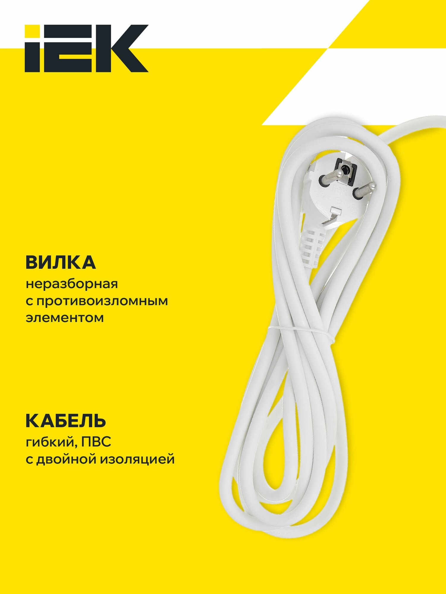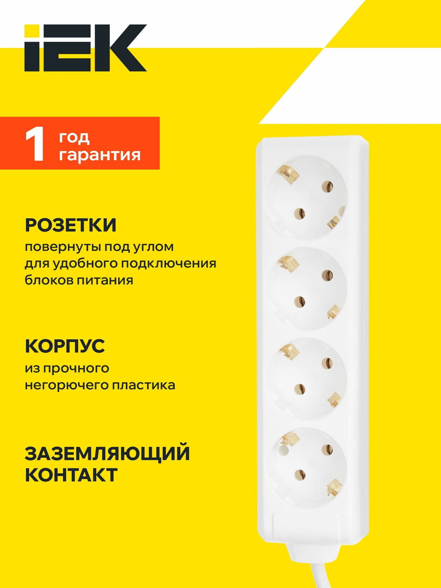 Удлинитель IEK У04, ПВС 3 x 1 мм², с заземлением, 4 розетки, 3 м, белый