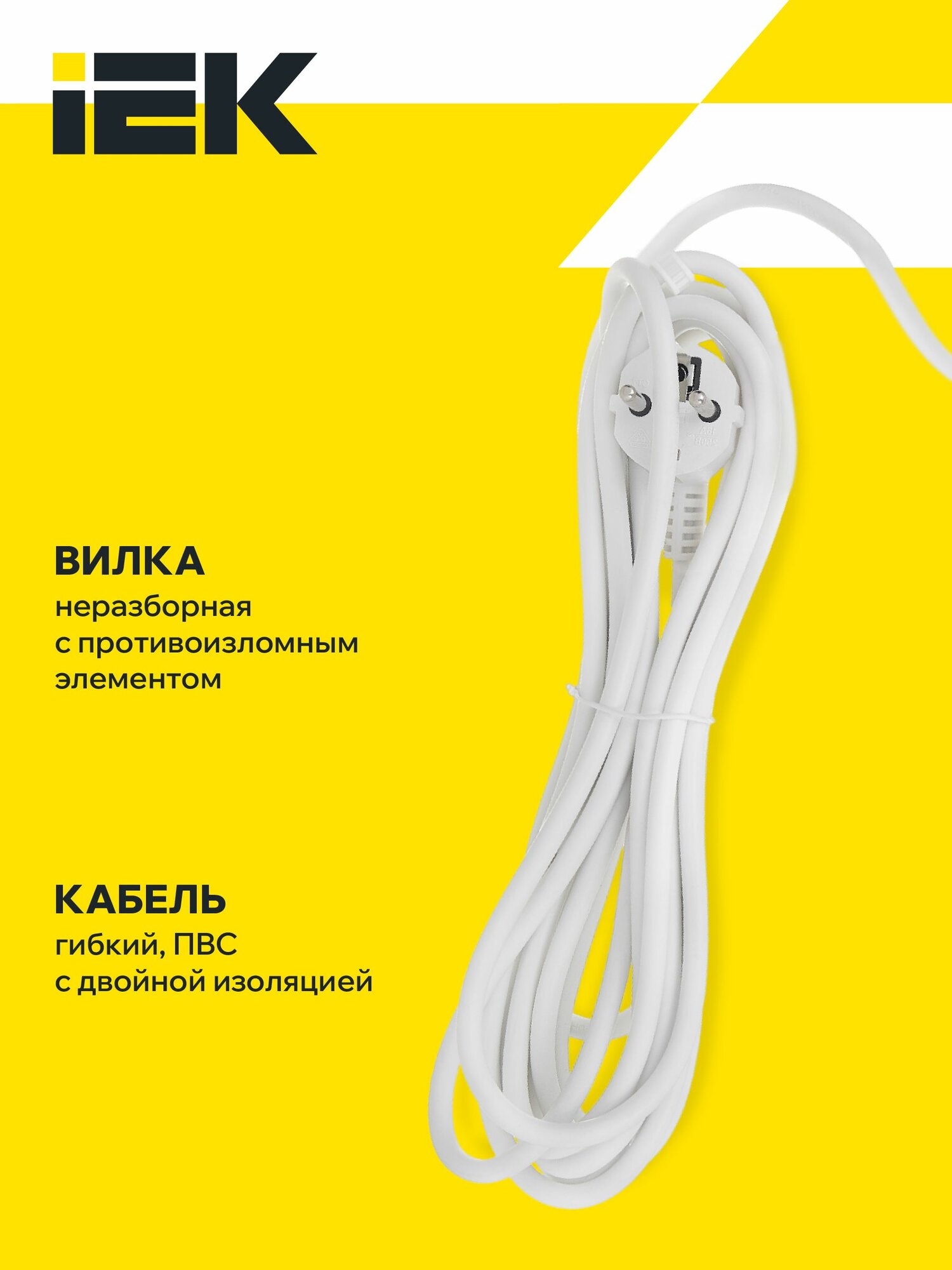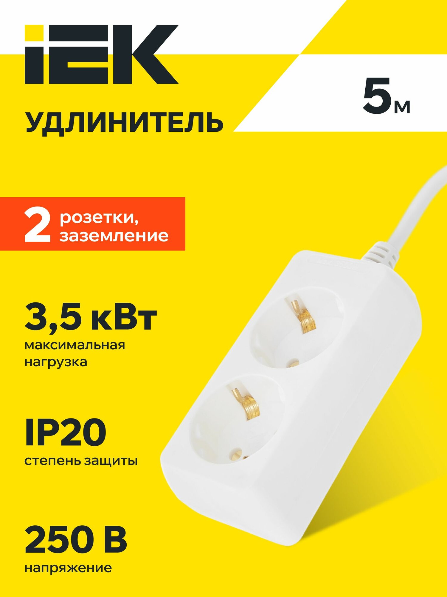 Удлинитель IEK У02, ПВС 3 x 1 мм², с заземлением, 2 розетки, 5 м, белый