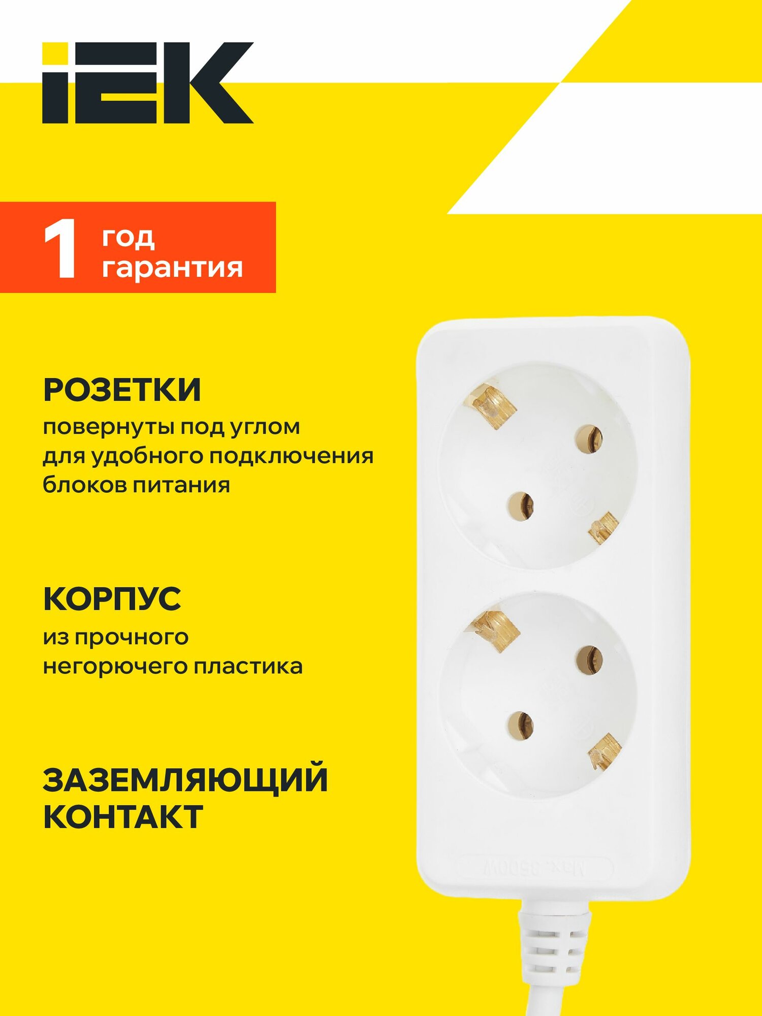 Удлинитель IEK WYP10-16-02-05-Z-N, 2 розетки, с/з, 16А / 3500 Вт белый 5 м 165 мм 75 мм 70 мм 1 м² 2 808 ₽