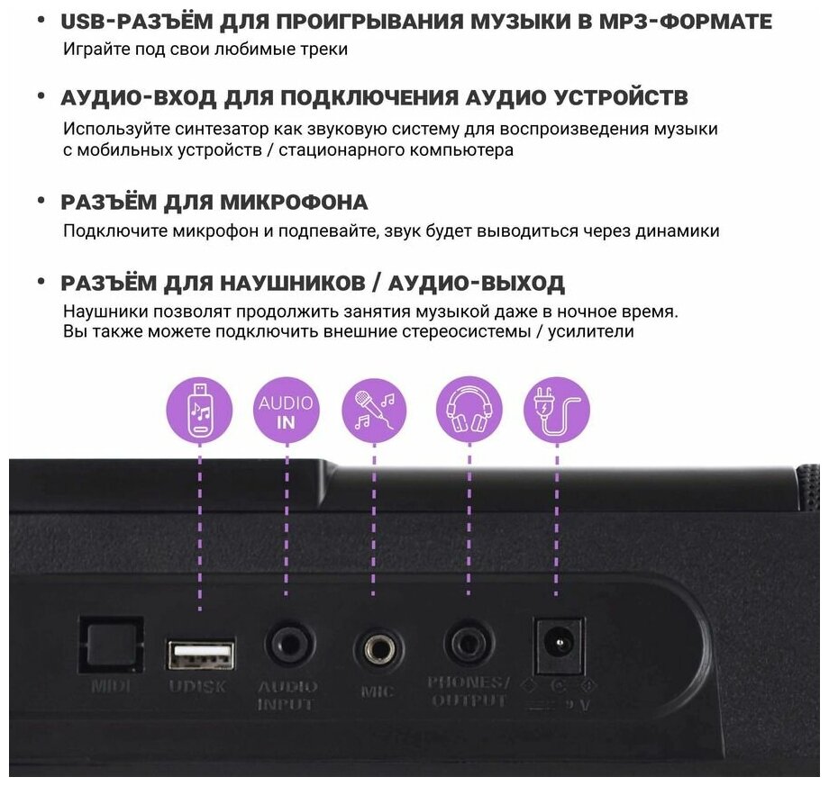 | Функции и опции | автоаккомпанемент / запись песен / метроном / обучение / чувствительность клавиатуры к касанию |