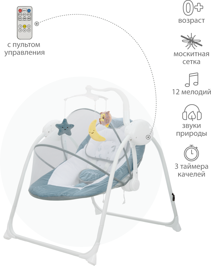 Электрокачели Indigo STAR с мобилем и пультом, серый 9 899 ₽