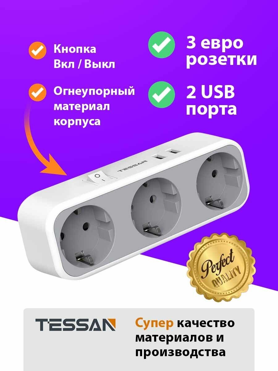 Сетевой фильтр без провода TESSAN TS-301-DE-C 3 розетки 2500 Вт + USB зарядка 2 порта до 3А + 1порт USB-C серый