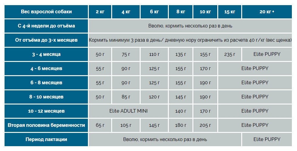 | Дозировка | Переход с другого корма на ELITE Starter puppy /puppy mini следует осуществлять постепенно, последовательно увеличивая часть ELITE Starter puppy /puppy mini. Корм можно давать как в сухом, так и в увлажнённом водой виде. Ежедневное количество корма должно быть скорректировано в зависимости от породы животного, веса и активности. У собаки всегда должен быть доступ к свежей питьевой воде. |