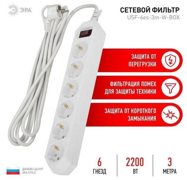 Usf-6Es-3M-W-Box Сетевой Фильтр Базовая Защита, С/З, С Выкл, 6Гн, 3М, Пвс, 10А, Белый ЭРА арт. Б0037262 информация: