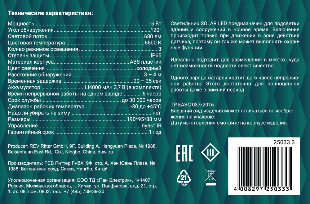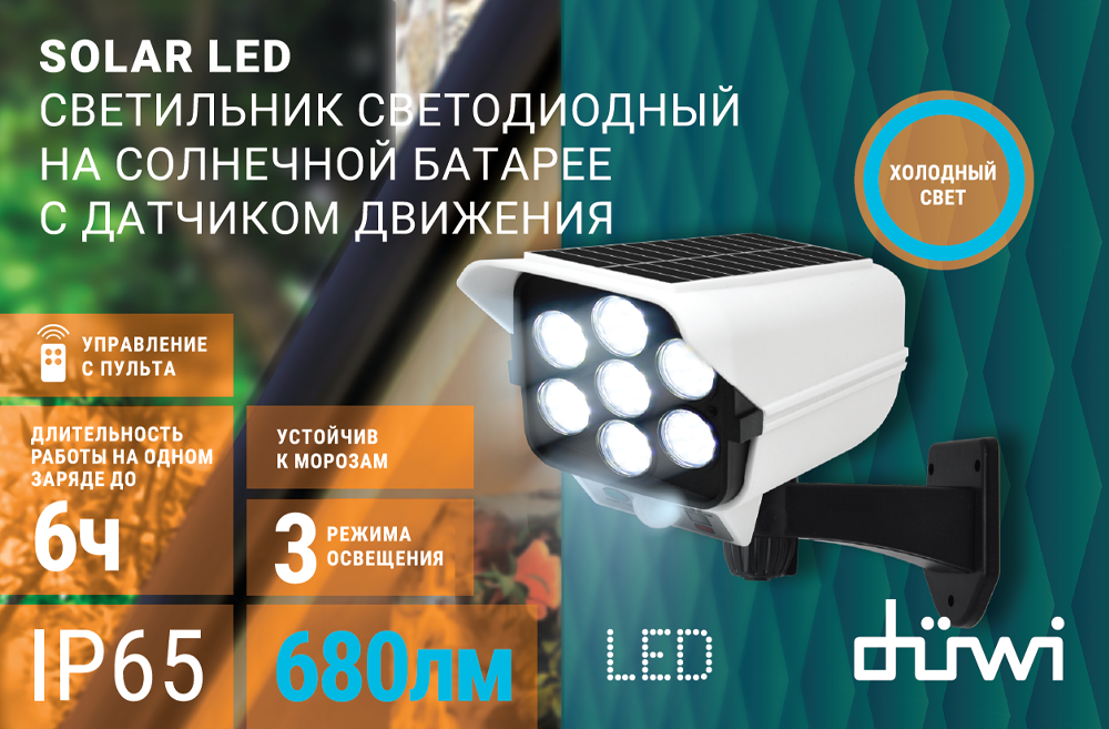 Светильник светодиодный с пультом ДУ и датчиком движения Solar LED на солнечных батареях 16Вт 6500К IP65 информация: