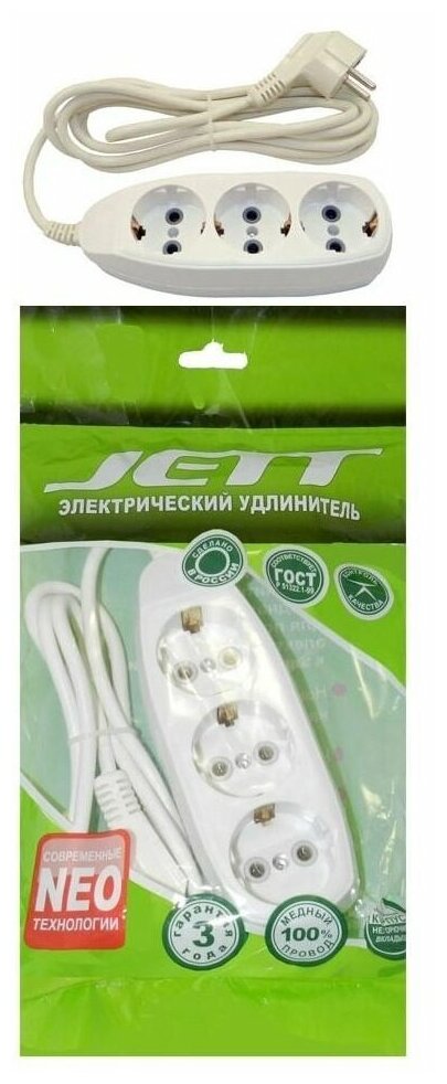 Отзывы на Удлинитель Jett 155-633 РС-3 (провод ПВС 3х0.75) , 3 розетки, 3 м, с/з, 16А / 2200 Вт белый