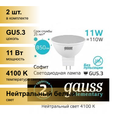 (2 шт.) Светодиодная лампочка Gauss Elementary MR16 GU5.3 220V 11W(850lm) 4100K 4K 50x50 матов., пластик 13521 информация: