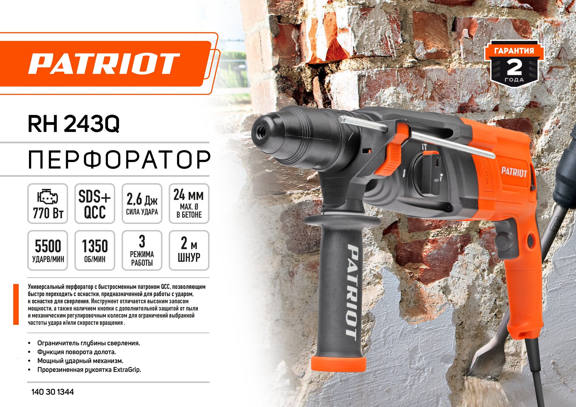 10 цен на Перфоратор электрический PATRIOT RH 243Q, SDS+, 770Вт, 2.6Дж, 3 режима работы, патрон QCC