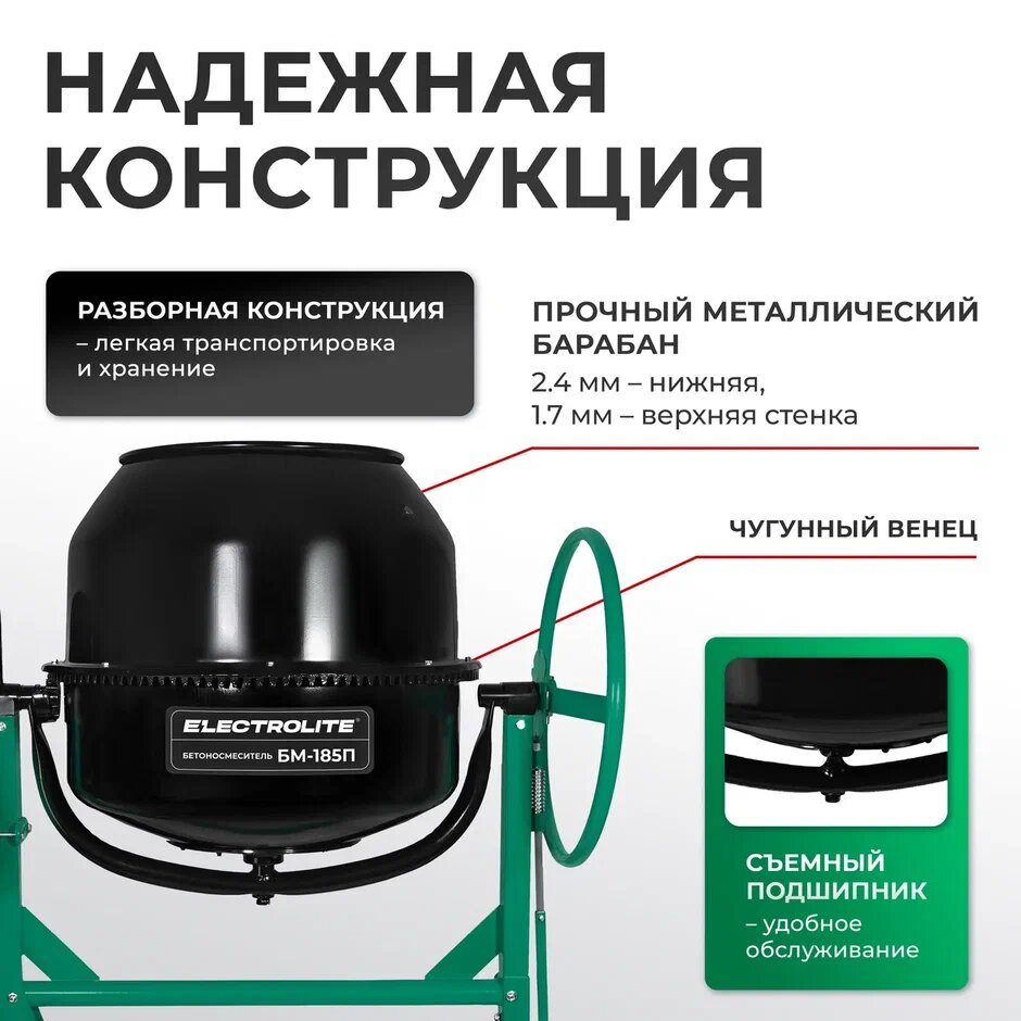 Бетоносмеситель строительный / Электрическая бетономешалка для дома и дачи Electrolite БМ-185П (1000 Вт, 185 л, педаль, чугунный венец) информация: