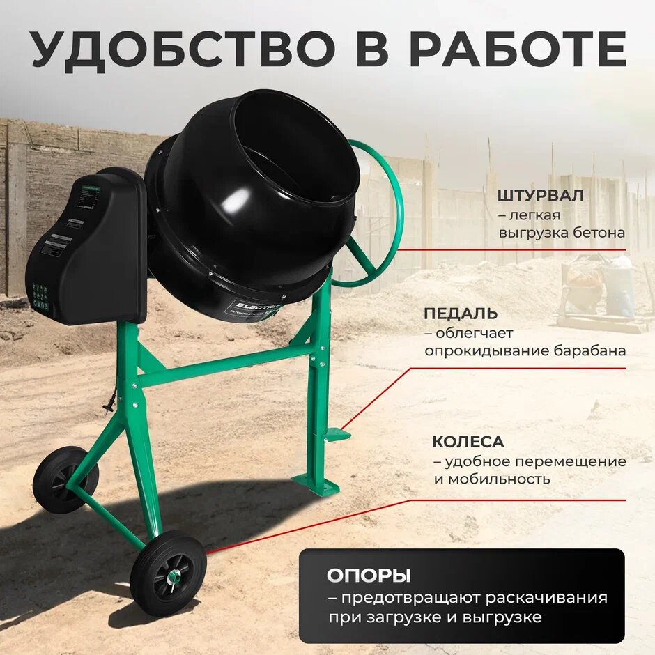 10 цен на Бетоносмеситель строительный / Электрическая бетономешалка для дома и дачи Electrolite БМ-185П (1000 Вт, 185 л, педаль, чугунный венец)