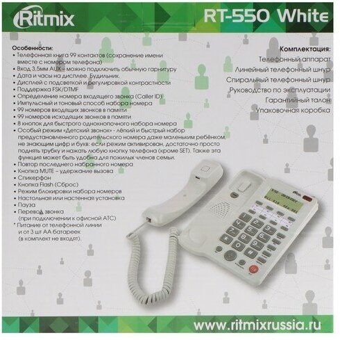 Телефон RITMIX RT-550 white, АОН, спикерфон, память 100 номеров, тональный/импульсный режим, белый, 80002154