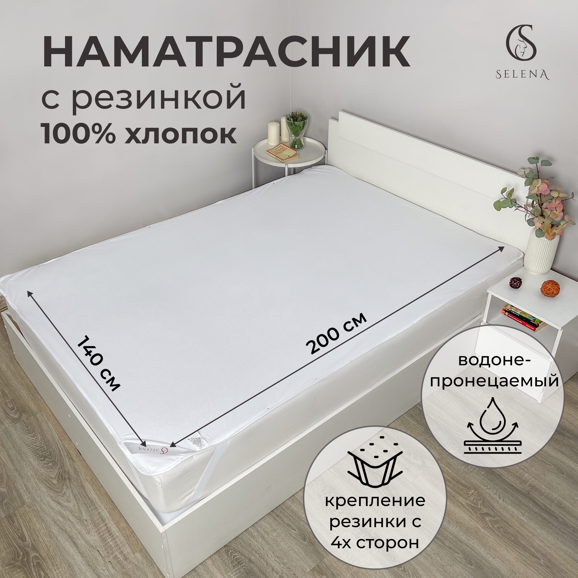 Наматрасник защитный SELENA мембранный водонепроницаемый 140х200 (см), махровый с резинками по углам, хлопок информация: