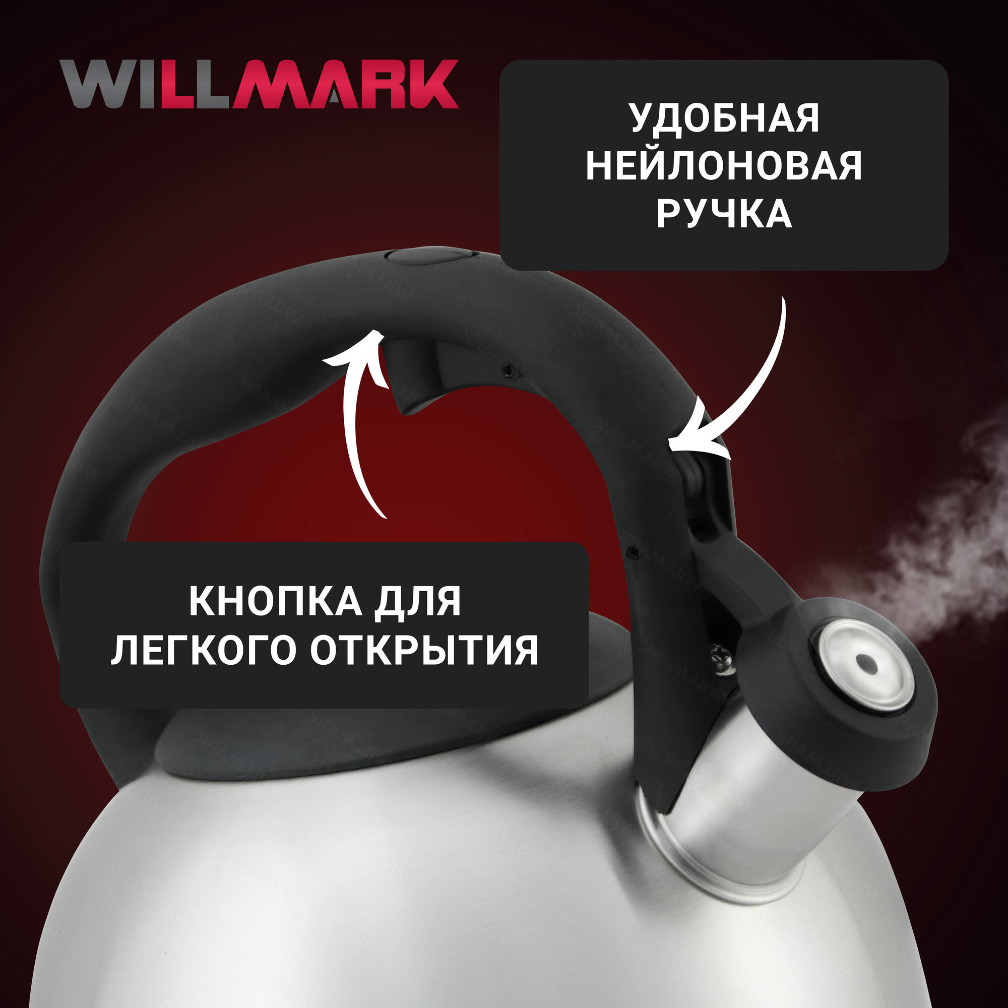 Чайник WILLMARK WTK-3229SS (2,5л, со свистком, с крышкой, нейлоновая ручка, техн. Easy spout open) информация: