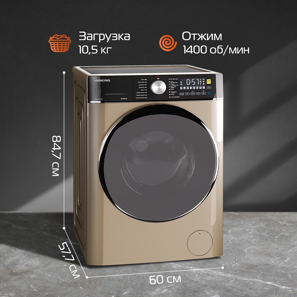 Стиральная машина с сушкой HIBERG i-WMQ8 - 10614 G, инверторная, с паром, 10,5 кг загрузка, 1400 об/мин, Золотистый информация: