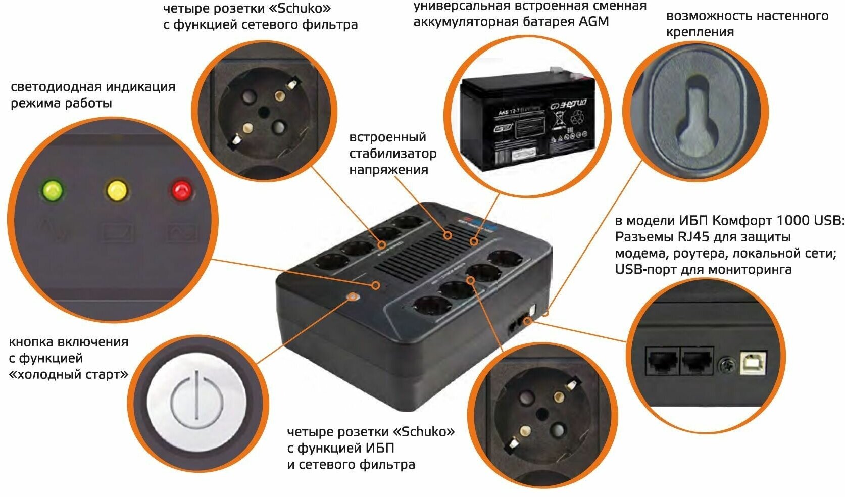 ИБП Комфорт 1000 USB Энергия {Е0201-1003}