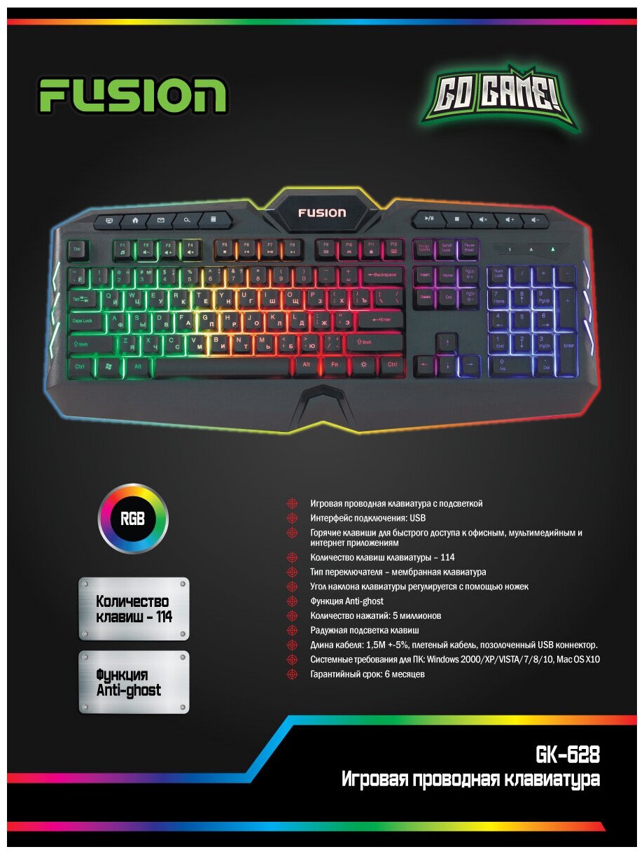 Клавиатура игровая FUSION мембранная для ПК, проводная с подсветкой, функция Anti-ghost, горячие клавиши информация: