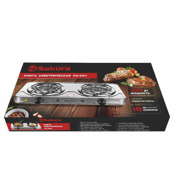 Плитка электрическая Sakura ПЭ-03Н, нержавеющая сталь, 2кВт, 145/145 мм, 2конфорки/спираль