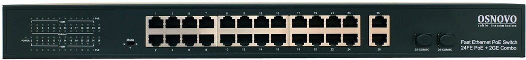 Коммутатор OSNOVO PoE 24 x 10/100 Base-T PoE, 2 x GE Combo Uplink (RJ45 + SFP), PoE на порт - до 30W, суммарно PoE до 385W информация:
