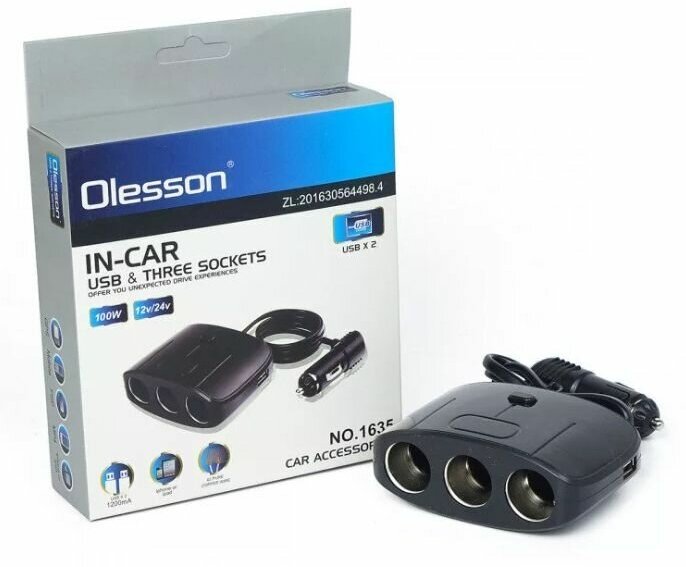 Разветвитель прикуривателя Olesson 1635, на 3 прикуривателя 2 USB выхода 800mAh с кабелем 1.2м