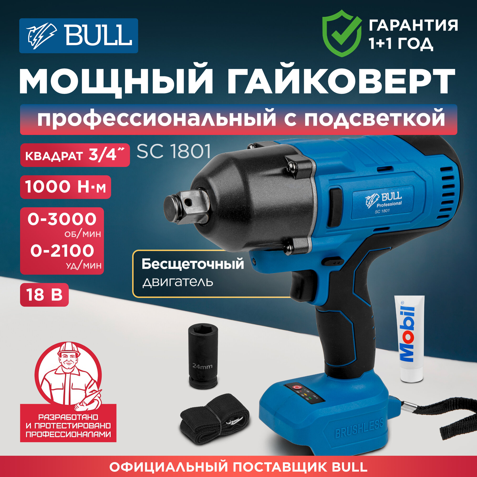 Аккумуляторный гайковерт BULL SC 1801 в кор. (18.0 В, без аккумулятора И ЗУ, Бесщеточный двигатель, тип посадки 3/4 \, 1000 Нм, вес 3.3 кг) (0329061)"