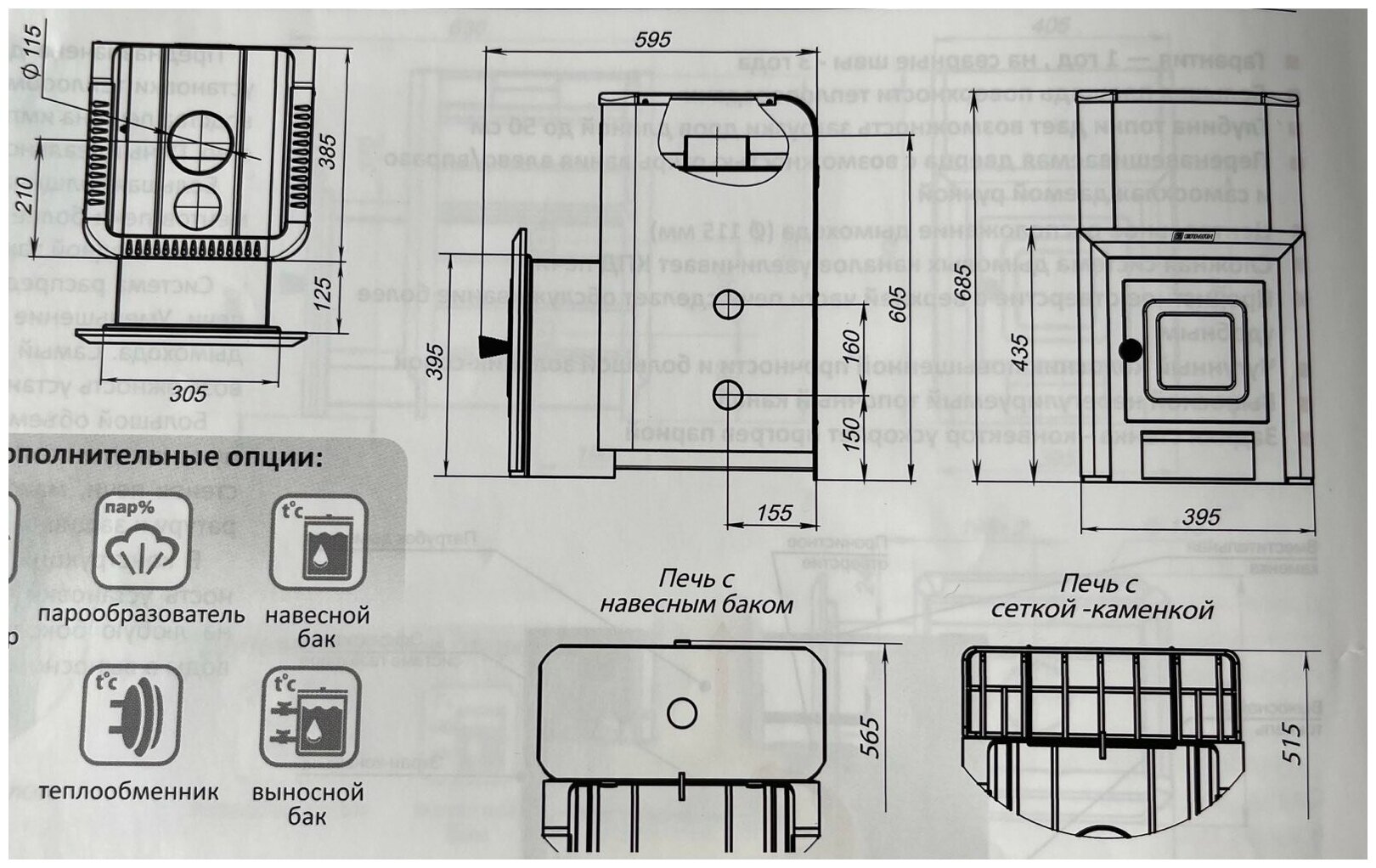 | Дополнительная информация | навесной бак, теплообменник, сетка-каменка, экран-конвектор, регулируемый тоннель – опционально |