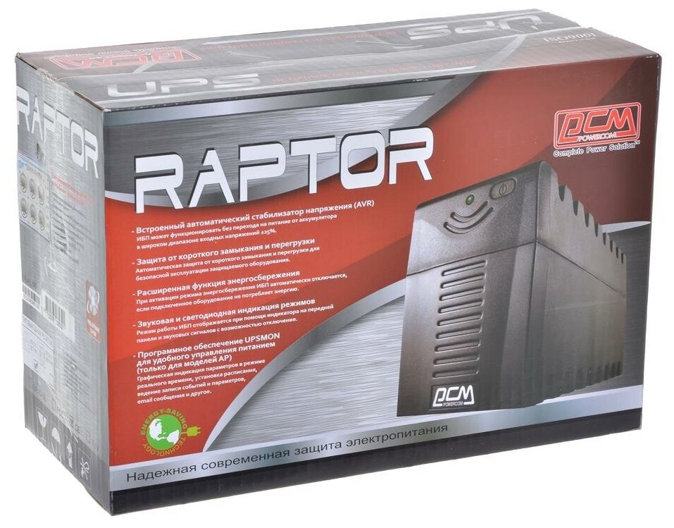PowerCom ИБП Интерактивный ИБП Powercom RAPTOR RPT-1000AP черный 1000 ВА/ 600 Вт, AVR, USB, RJ11/RJ45, 3 розетки IEC320 C13 с резервным питанием 7 311 ₽