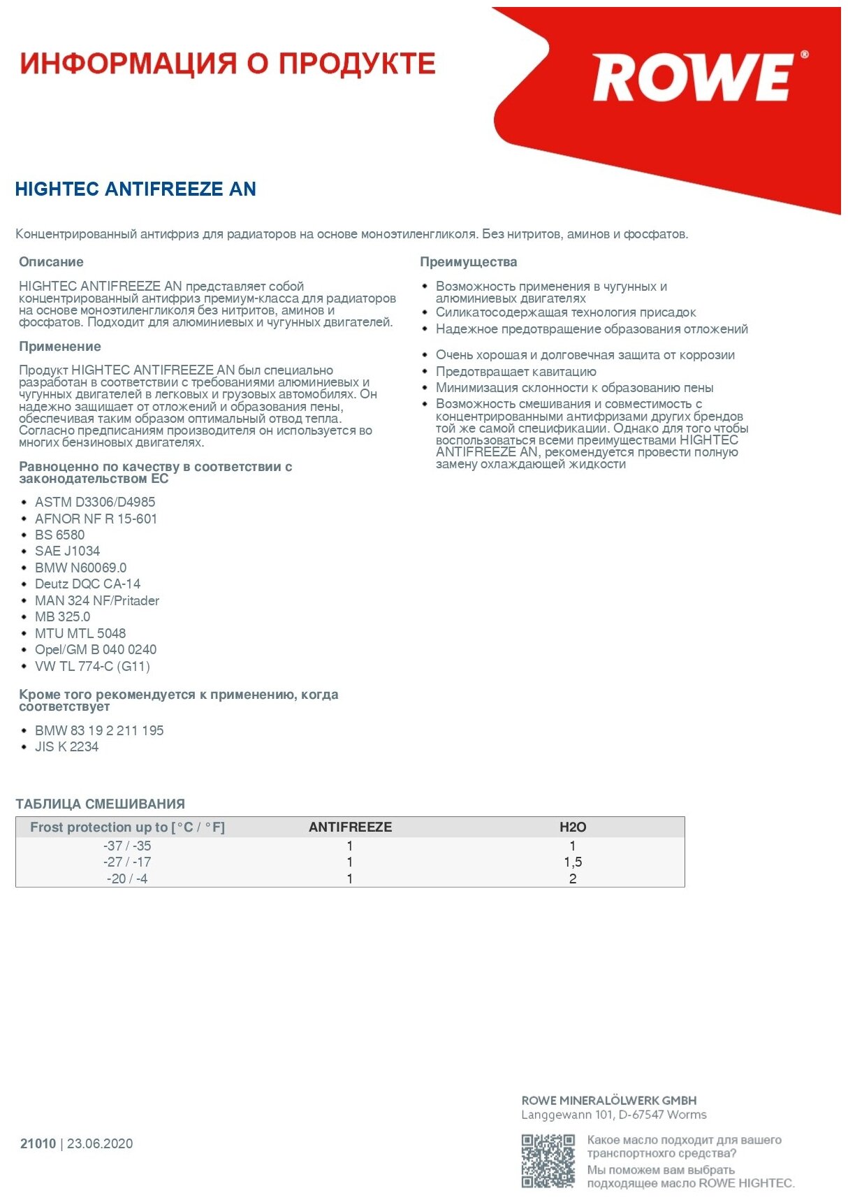 Отзывы на 21010-0050-99 Охлаждающая Жидкость Hightec Antifreeze An G11 (5 Л) ROWE арт. 21010005099