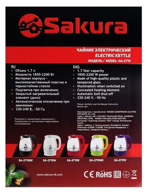 Чайник SAKURA SA-2715V (1.7) стекл подсв информация:
