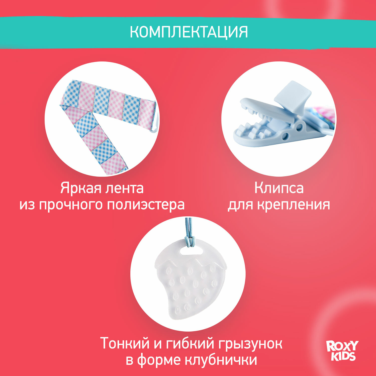 Прорезыватель на держателе ROXY Клубничка. Цвет голубой-розовый (клеточка). Материал держателя -полиэстер, АБС-пластик, Материал прорезывателя -ТЭП 173 ₽