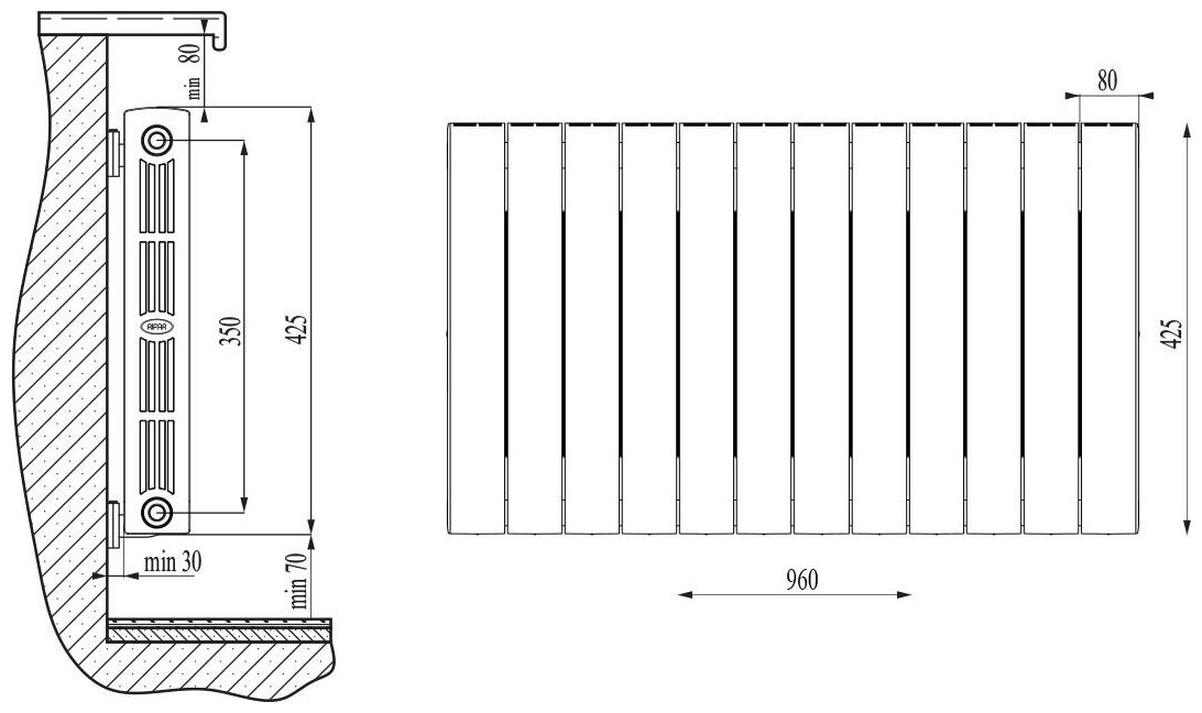 Радиатор секционный Rifar SUPReMO 350, кол-во секций: 12, 16.8 м2, 1680 Вт, 960 мм., подключение боковое правое