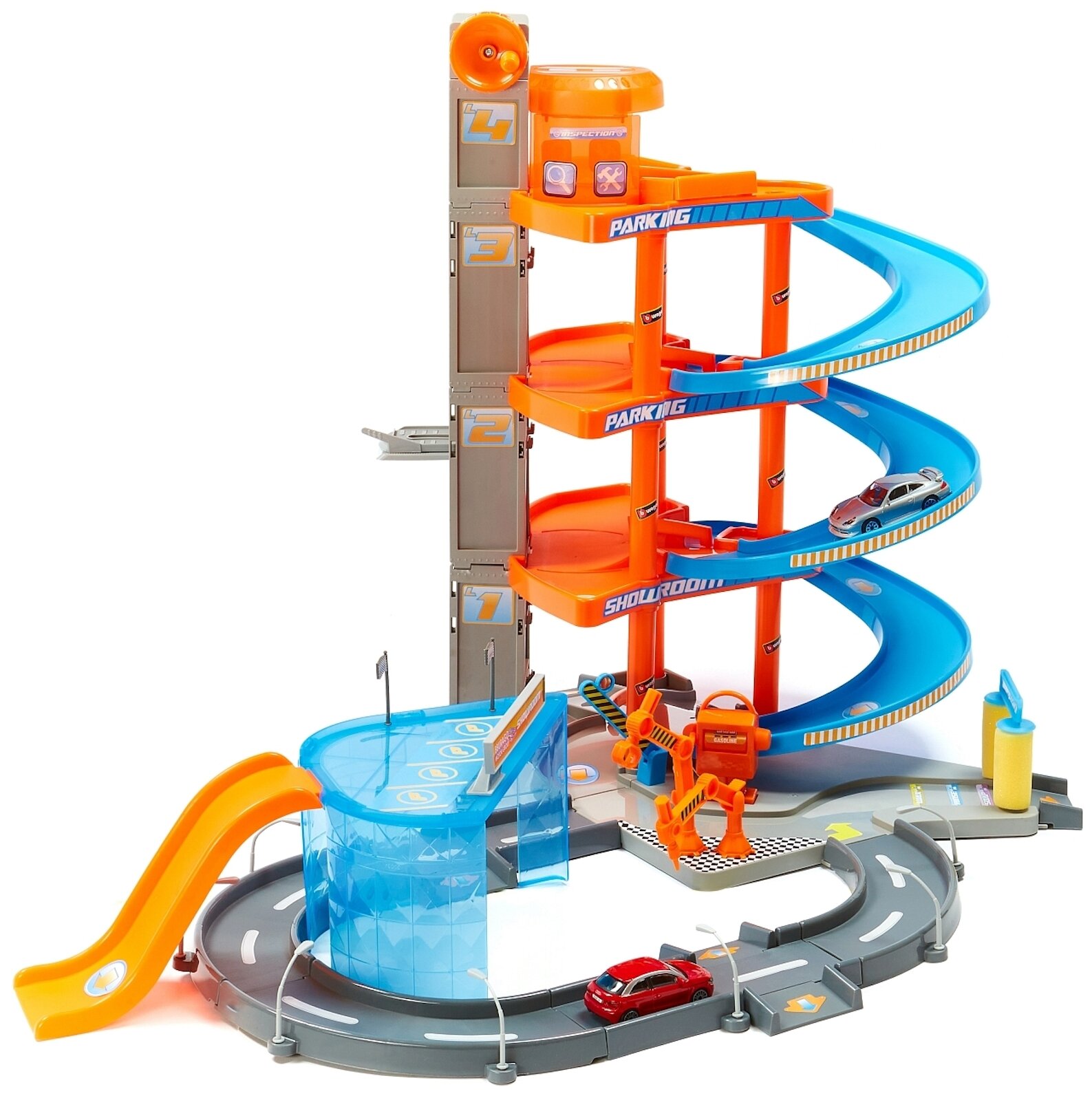 Bburago Паркинг 4-х уровневый Mega Dealer Showroom Центр Продаж авто с 2 машинами 18-30031, оранжевый/голубой/серый информация: