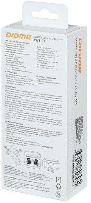 Беспроводные наушники DIGMA TWS-01, черный информация: