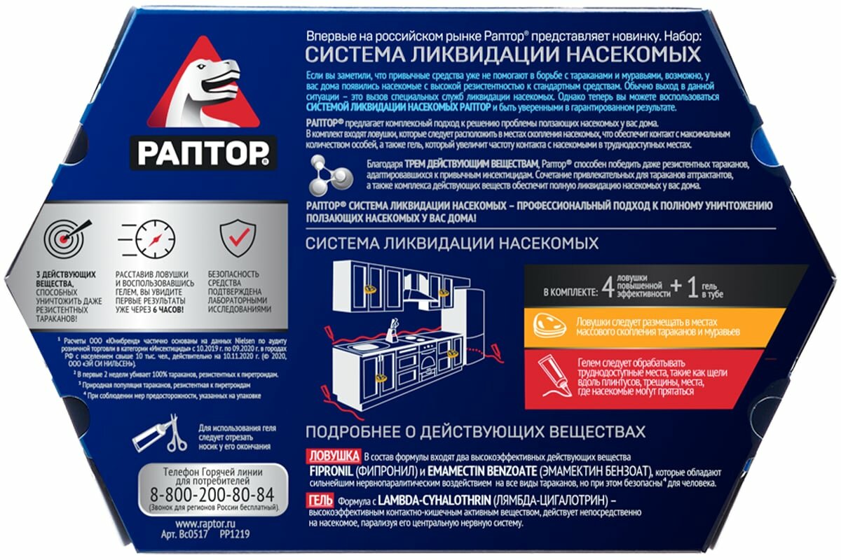 Средство от насекомых Раптор 4 Ловушки и гель система ликвидации тараканов и муравьев