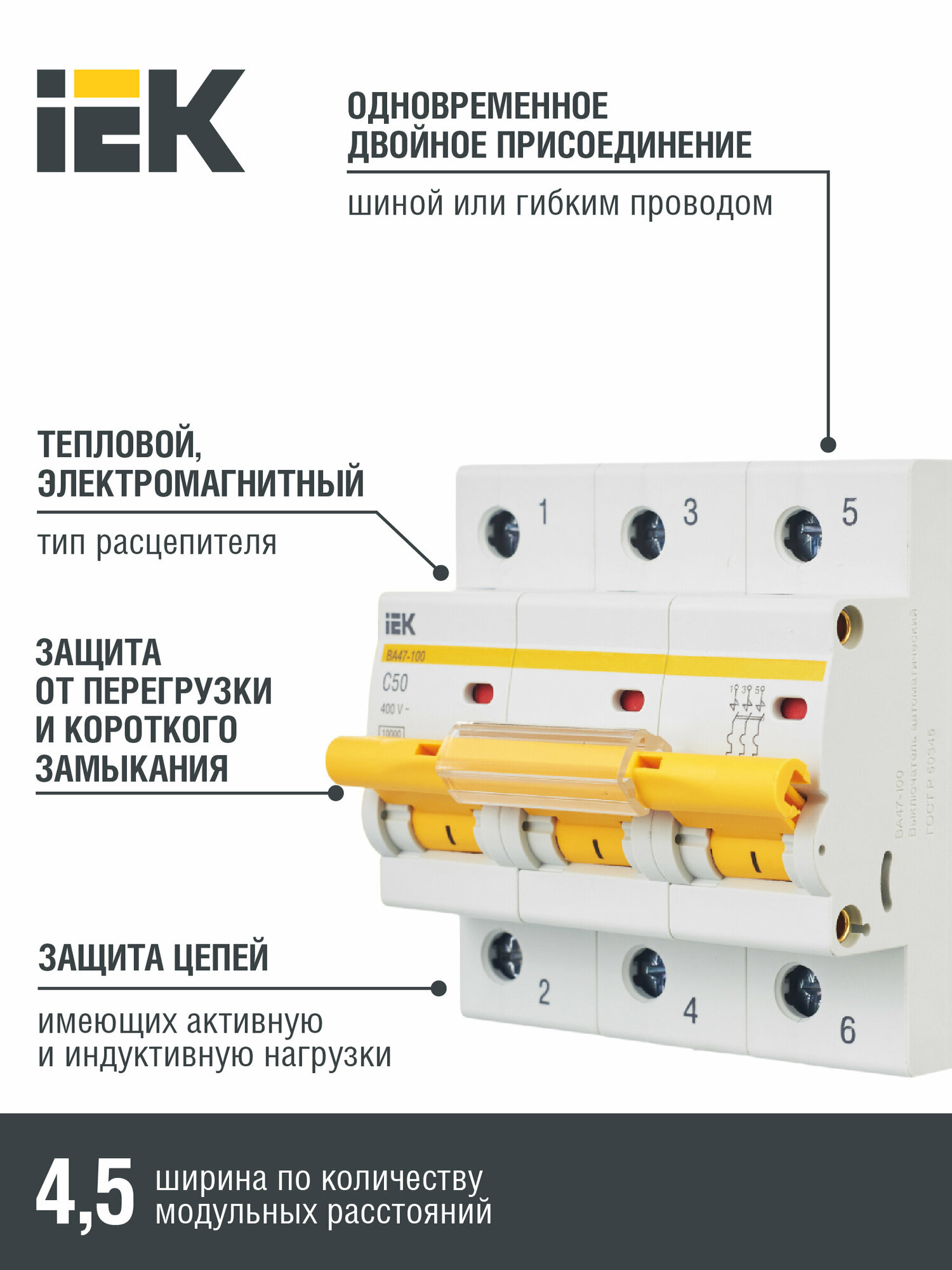 Выключатель автоматический трехполюсный ВА47-100 50А C 10кА. MVA40-3-050-C IEK информация: