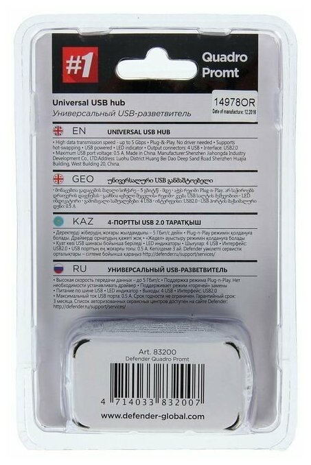Разветвитель USB HUB DEFENDER #1 QUADRO Promt USB2.0, 4 порта информация: