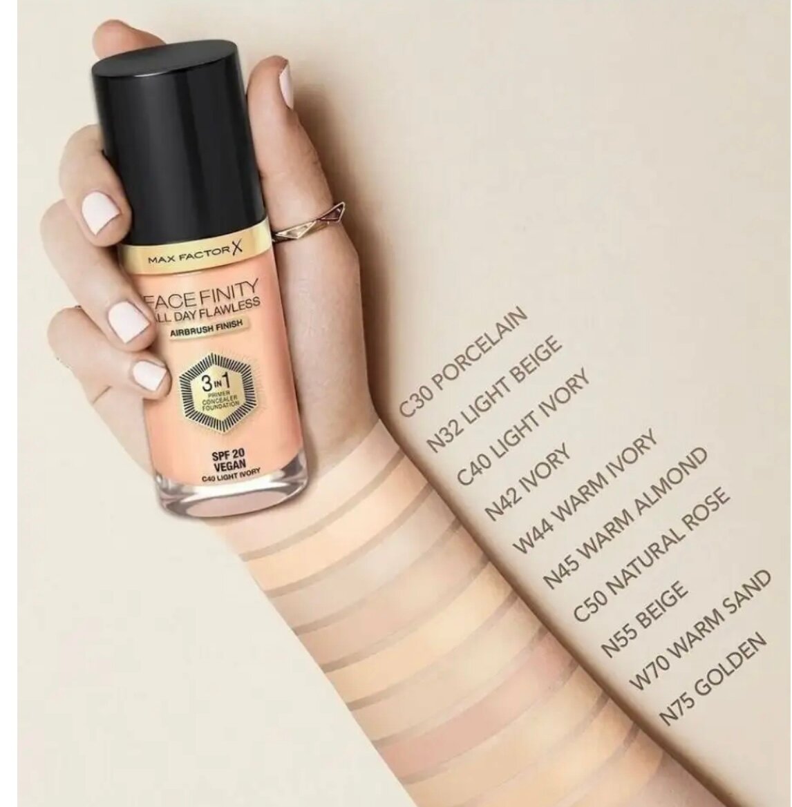 Max Factor Тональная эмульсия Facefinity All Day Flawless 3-in-1, SPF 20, 30 мл, оттенок: 40 Light Ivory