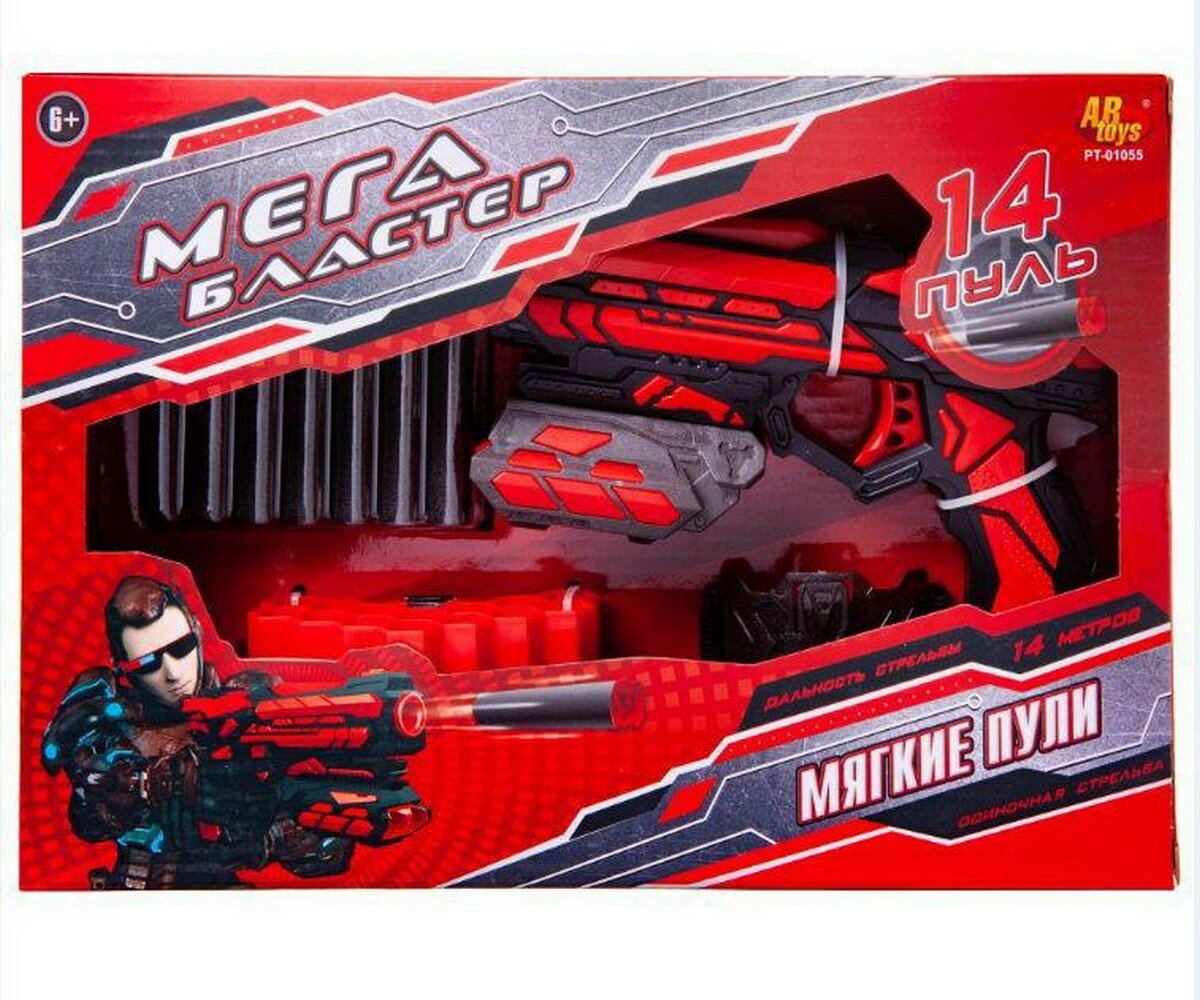 Мегабластер Бластер красно-черный с 14 мягкими пулями, в коробке