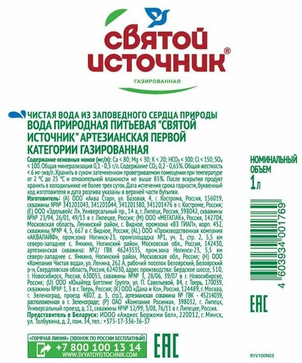 Вода питьевая Святой Источник газированная, ПЭТ 1 л информация: