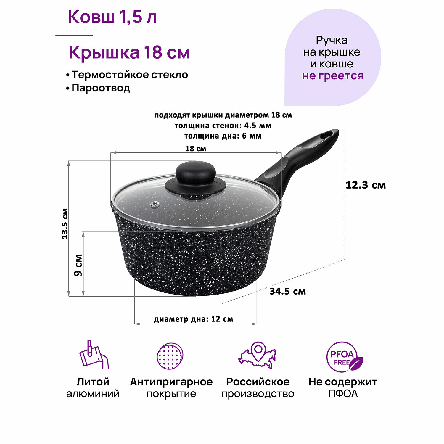 Ковш 1,5 л Elan Gallery гармония вкуса Черный мрамор ковшик кухонный с крышкой толстостенный из литого алюминия с двухслойным антипригарным покрытием с несъемной ручкой Идеальный подарок на Новый год Рождество День Рождения и 8 марта