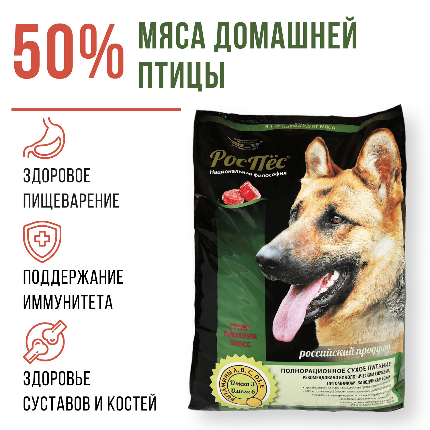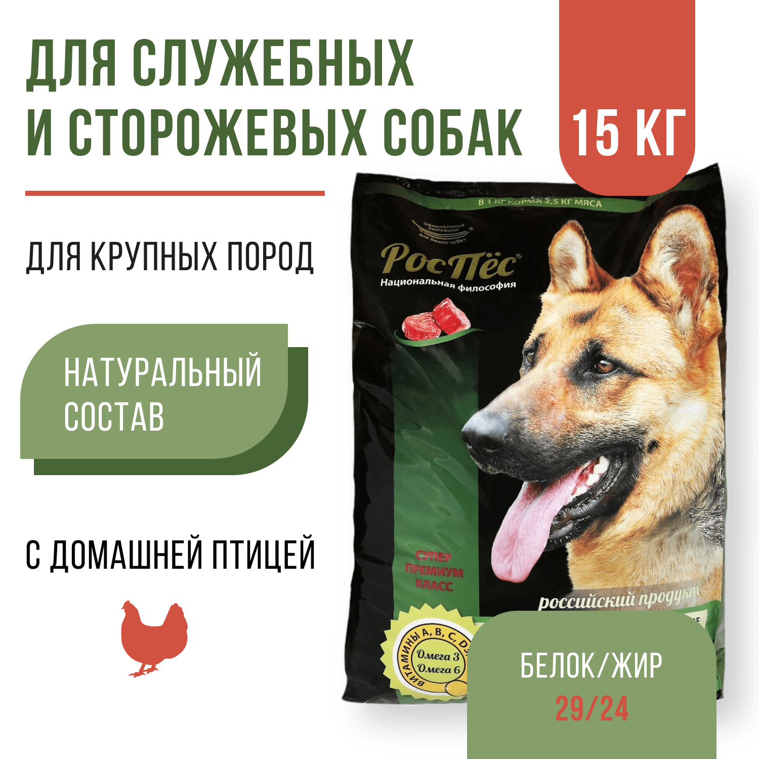 Сухой корм для активных и служебных собак премиум класса со вкусом домашней птицы РосПёс, Альфа, 15 кг информация: