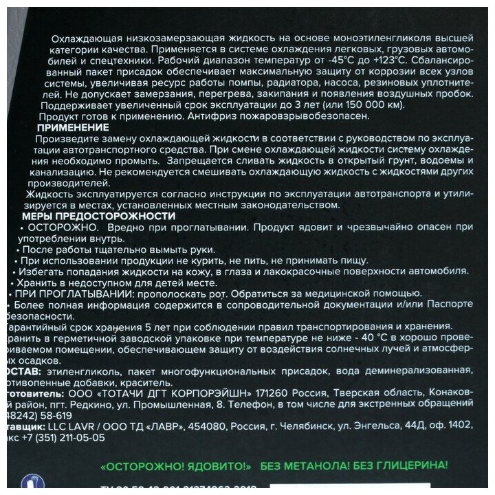 Антифриз ANTIFREEZE LAVR -45 G11, 5 кг Ln1706 LAVR 4609577 .