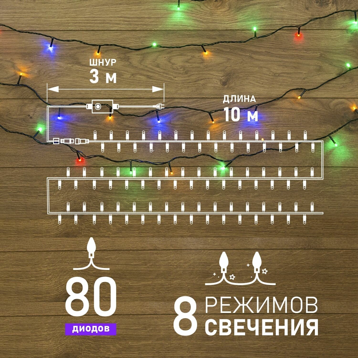 Светодиодная гирлянда NEON-NIGHT "Твинкл-Лайт" 10 м, 8 режимов, 80 разноцветных светодиодов, тёмно-зелёный провод 680 ₽
